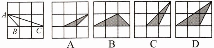 1. 如图,每个正方形均由边长为1的小正方形组成,则下列图形中的三角形(阴影部分)与$\triangle A B C$相似的是(