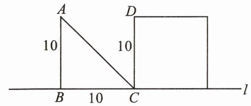 如图,等腰直角三角形 $ ABC $ 以 $ 2 \, m/s $ 的速度沿直线 $ l $ 向正方形移动,直到 $ AB $ 与 $ CD $ 重合. 设 $ x \, s $ 时,三角形与正方形重叠部分的面积为 $ y \, m^{2} $.