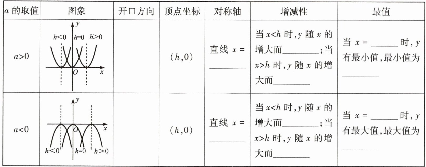 | $ a < 0 $ | | 向下 | $ (h, 0) $ | 直线$ x = h $ | 当$ x < h $时,$ y $随$ x $的增大而增大;当$ x > h $时,$ y $随$ x $的增大而减小 | 当$ x = h $时,$ y $有最大值,最大值为0 |