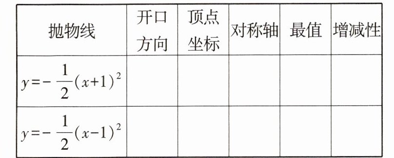 画出二次函数 $ y = -\frac{1}{2}(x + 1)^2 $,$ y = -\frac{1}{2}(x - 1)^2 $ 的图象,并思考它们的开口方向、对称轴、顶点坐标、最值和增减性。