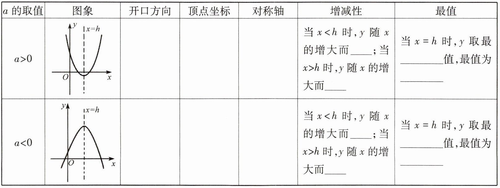 | $a$的取值 | 图象 | 开口方向 | 顶点坐标 | 对称轴 | 增减性 | 最值 |