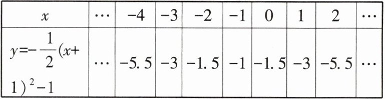 开口方向:向下。对称轴:$x = - 1$。顶点坐标:$( - 1, - 1)$。抛物线$y = -\frac{1}{2}x^{2}$向左平移$1$个单位长度,再向下平移$1$个单位长度得到抛物线$y = -\frac{1}{2}(x + 1)^{2}-1$。