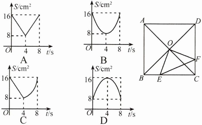 1. 如图,在正方形$ABCD$中,$AB = 8$cm,对角线$AC$,$BD相交于点O$,点$E$,$F分别从B$,$C$两点同时出发,以1cm/s的速度沿$BC$,$CD$运动,到点$C$,$D$时停止运动.设运动时间为$t$(单位:s),$\triangle OEF的面积为S$(单位:cm^2),则$S与t$的函数关系可用图象表示为(