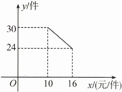 (1)设y与x之间的函数解析式为y=kx+b(k≠0)。由题意及图像可知,当x=10时,y=30;当x=16时,y=24。将(10,30),(16,24)代入y=kx+b,得: