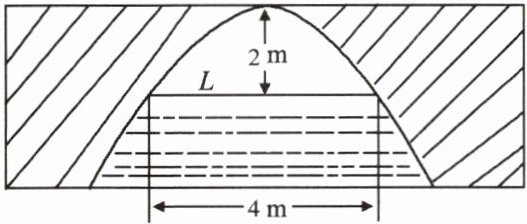 有一座抛物线形拱桥如图所示,当水面在 $ L $ 时,拱顶离水面 $ 2 \, m $,水面宽 $ 4 \, m $. 水面下降 $ 1 \, m $ 时,水面宽度增加多少?