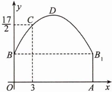 变式 如图,隧道的截面由抛物线和长方形构成,长方形的长是 $ 12 \, m $,宽是 $ 4 \, m $. 按照图中所示的直角坐标系,抛物线可以用 $ y = - \frac{1}{6}x^{2} + bx + c $ 表示,且抛物线上的点 $ C $ 到 $ OB $ 的水平距离为 $ 3 \, m $,到地面 $ OA $ 的距离为 $ \frac{17}{2} \, m $.