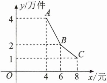 5. 为了支持大学生创业,某市出台了一项优惠政策:提供 $10$ 万元的无息创业贷款。小王利用这笔贷款,注册了一家网店,招收 $5$ 名员工,销售一种电子产品,并约定用该网店经营的利润,逐月偿还这笔无息贷款。已知该产品的成本为每件 $4$ 元,员工每人每月的工资为 $4000$ 元,该网店还需每月支付其他费用 $1$ 万元。该产品每月销售量 $y$(单位:万件)与销售单价 $x$(单位:元)之间的函数关系如图所示。