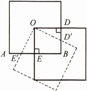 2. 另一个正方形绕$O$旋转任意角度,设其边与$AB$交于$E$,与$BC$交于$F$。由于旋转正方形的边互相垂直,可得$\angle EOF=90°$。