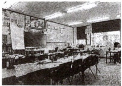 This is a classroom in the UK. There are many things in the room. There's a screen in front of/ on the wall. A whiteboard is next to/between the screen. There are some bookcases behind / under them. The teacher's desk is in the comer, across from / in front of a window. Students sit between / on chairs at long tables, but today there aren't any students.