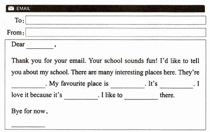 Thank you for your email. Your school sounds fun! I'd like to tell you about my school. There are many interesting places here. They're great. My favourite place is the library. It's big. I love it because it's quiet. I like to read books there.