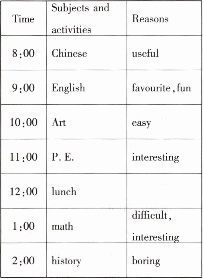 I'm very busy on Friday. At 8:00, I have Chinese because it's useful. My next class is English at 9:00, which is my favourite subject and it's fun. At 10:00, I have Art. It's easy for me. Then at 11:00, I have P.E. and it's interesting. I have lunch at 12:00. In the afternoon at 1:00, I have math. It's difficult but interesting. Finally, at 2:00, I have history. I think it's boring.