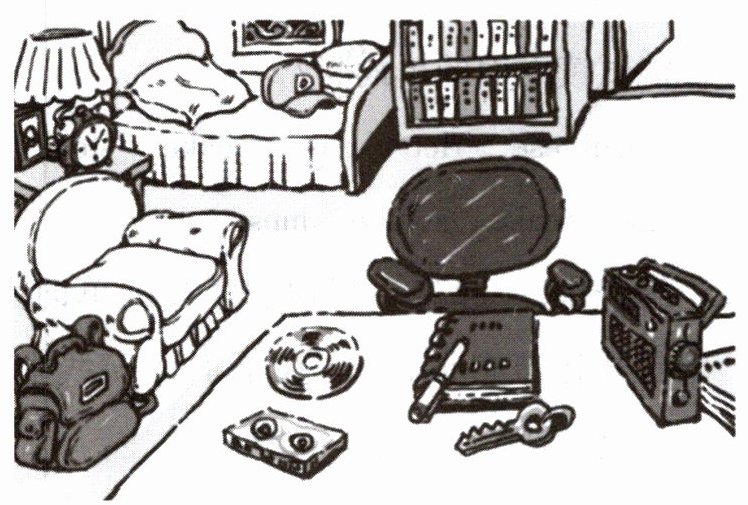 bed; book; clock; CD; chair; desk; pen; schoolbag; tape; radio; key; lamp