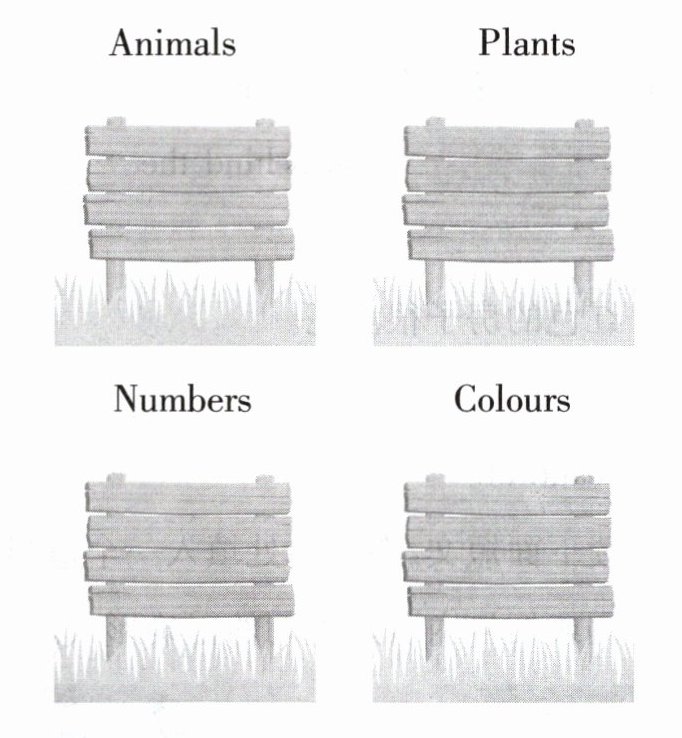 参考本单元出现的有关动物、植物、颜色、数字的单词,把他们分类归纳到下图中吧。