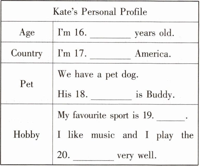 16.12/Twelve 17.from 18.name 19.tennis 20.guitar