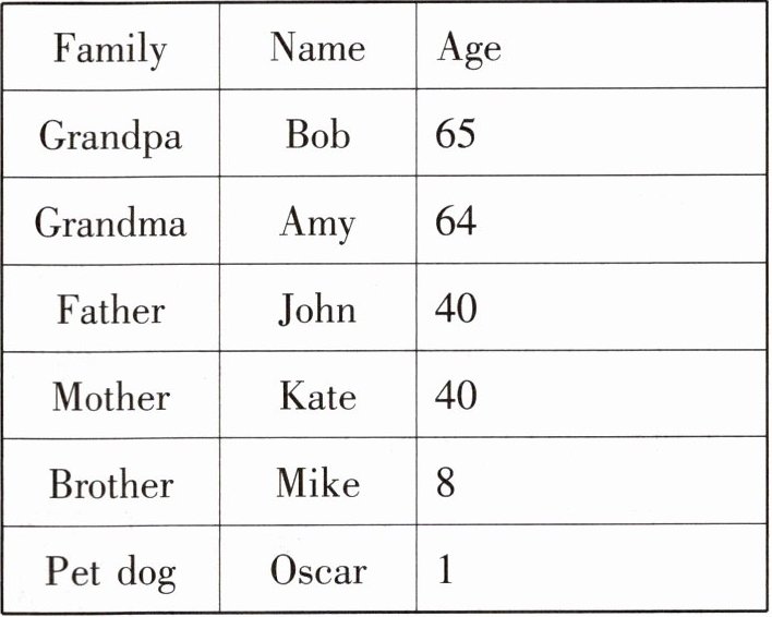 Eric is an English boy. 1 is 11 years old. He is in a middle school. Is he in 2 5,Grade 1? Yes,he is. This is 3 family photo. His 4 is 65. He is the 5 of Amy,the grandma. John is the 6 of Amy,and he is also Eric's 7. Kate is his mother,and she is 40 now. Mike is Eric's 8. He likes fishing,and that fishing rod is his. He also has a pet 9. 10 name is Oscar. We often play games together.