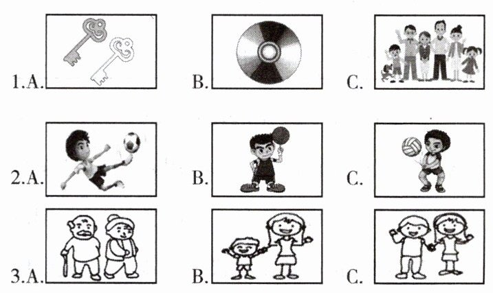 A.录音中有三段短对话,从题中所给的 A、B、C 三个选项中,选出与之相符的图片。(每段对话读两遍。)