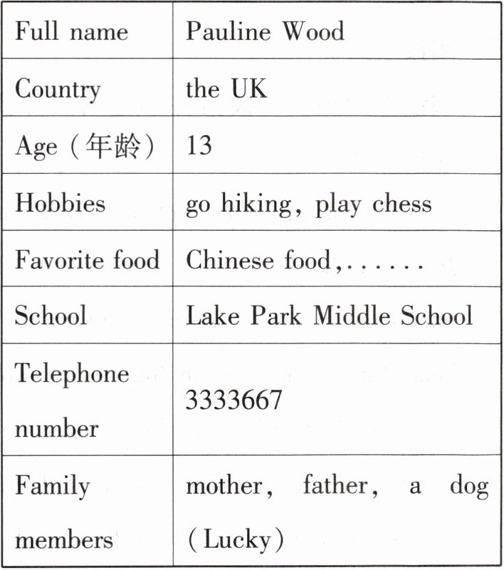 Her full name is Pauline Wood. She is from the UK and she is 13 years old. She studies at Lake Park Middle School. Her hobbies are going hiking and playing chess. Her favorite food is Chinese food, and she also likes ice cream. Her telephone number is 3333667. There are four members in her family: her mother, her father, her dog Lucky and her. She loves her family very much.