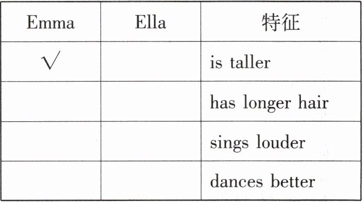 4. 听第二段对话,完成 Emma 和 Ella 的对比表格。