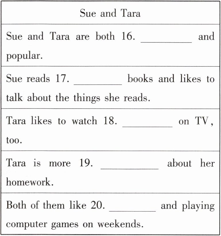 16. outgoing 17. more 18. sports 19. serious 20. shopping