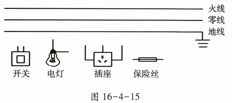 7. 将图16-4-15中各元件接入电路,其中开关只控制电灯,三孔插座带保险丝。