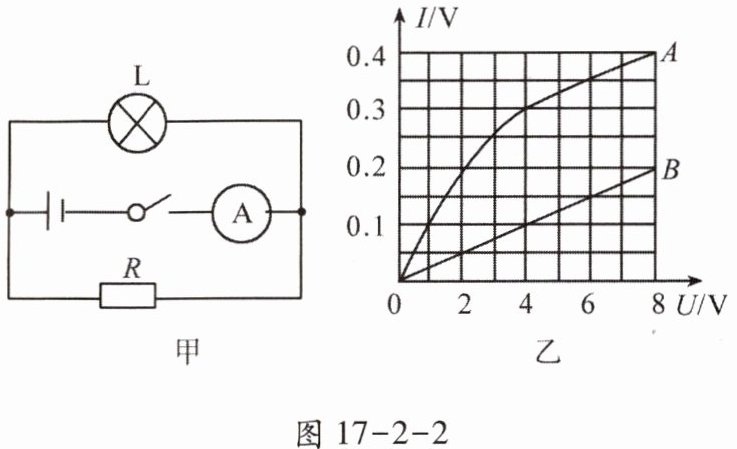 8. 小灯泡L和定值电阻R接在如图17 - 2 - 2甲所示的电路中,其两者的I - U关系图像如图乙所示,闭合开关,下列说法中正确的是(