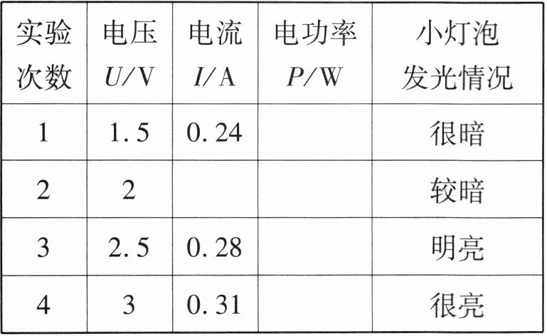 $W$.|实验次数|电压 $U/V$|电流 $I/A$|电功率 $P/W$|小灯泡发光情况|