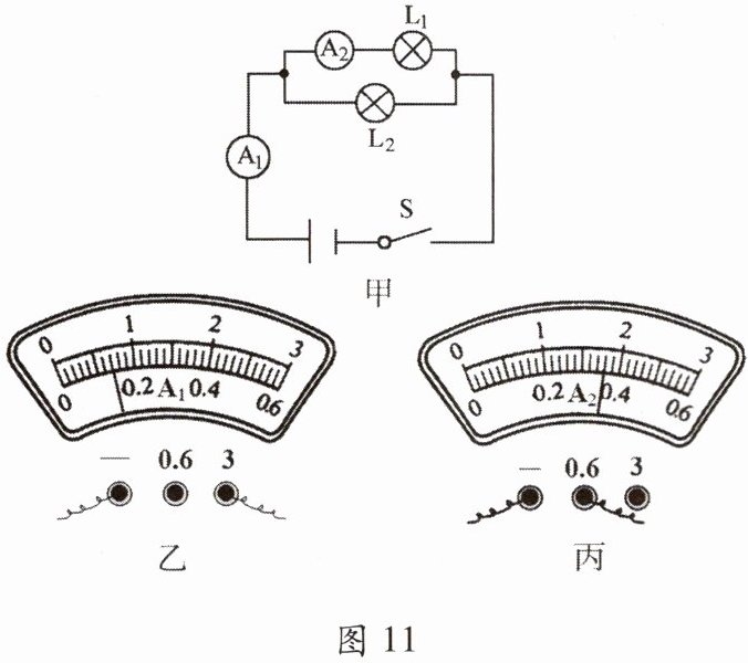 19. 用电流表测量图11甲所示电路中的电流时,电流表$ A_{1} 和 A_{2} $的指针分别处于图乙、丙所示的位置,则通过灯泡$ L_{1} $的电流是