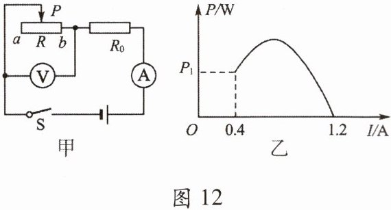 20. 在如图12甲所示的电路中,电源电压保持不变,R为滑动变阻器,其规格为“$ 20Ω \ \ 1.5A $”,闭合开关S,当滑片P从一端滑到另一端的过程中,测到R的电功率与通过它的电流关系图像如图乙所示,则电源电压为