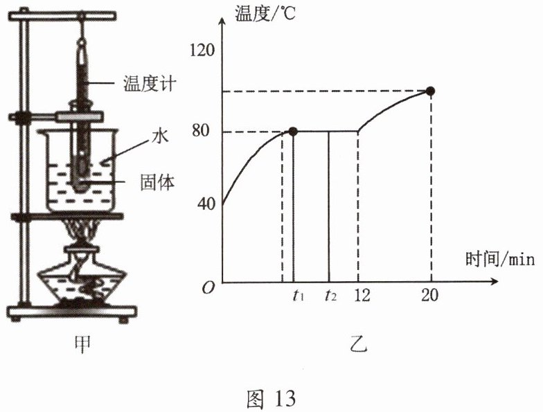 21. 如图13甲,是“探究某种固体物质熔化特点”的实验装置,图13乙是根据实验数据描绘出的该物质在熔化过程中温度随时间变化的图像.