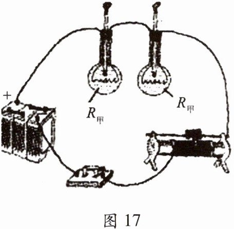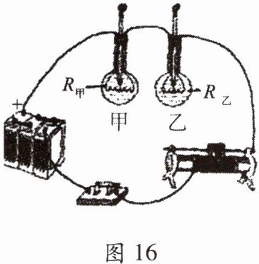 24. 为了探究影响电热的因素,小伟设计了如图16所示电路,烧瓶中盛有质量、初温均相等的煤油,$ R_{甲} > R_{乙} $.