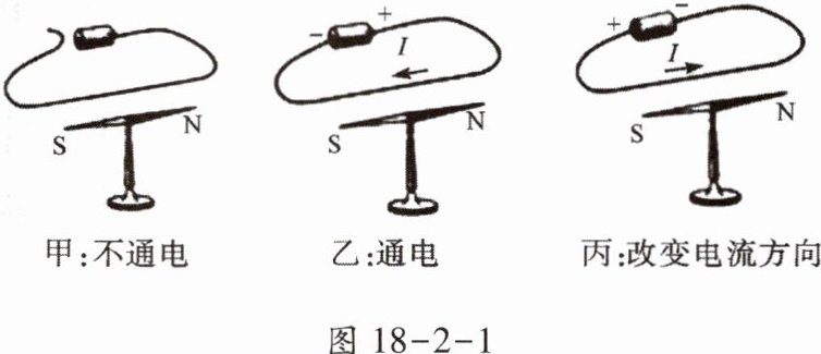 活动 1:如图 18 - 2 - 1 甲所示,当小磁针静止时,将导线平行地拉在小磁针上方,然后实验、观察: