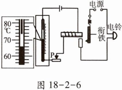 4. 如图 18 - 2 - 6 所示是种温度自动报警器的原理图. 制作水银温度计时,在玻璃管的两端分别封入一段金属丝. 电池的两极分别与金属丝相连,当温度达到与电池正极相连的金属丝下端所指的温度时,电铃就响起来,发出报警信号. 下列说法正确的是(