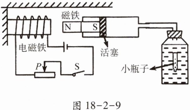 7. 在科技晚会上,小明给大家展示了一个“听话”的小瓶子,它的原理如图 18 - 2 - 9 所示(磁铁固定在活塞上)闭合开关 S 后,通过调节滑片,就可以让小瓶子上浮、下沉或悬停在水中,对此以下分析正确的是(