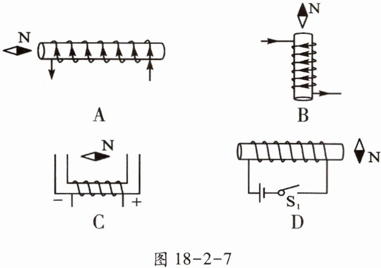 5. 如图 18 - 2 - 7 中,小磁针静止后指向正确的是(