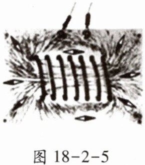 3. 在探究通电螺线管外部磁场的方向时,玻璃板上均匀地撒上铁屑,闭合开关,轻敲玻璃板,铁屑的分布形状如图 18 - 2 - 5 所示,铁屑在玻璃板上的分布与