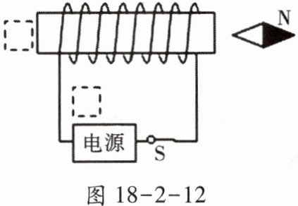 10. 开关 S 闭合后,小磁针静止时指向如图 18 - 2 - 12 所示. 请在图中两个虚线框内分别标出螺线管的磁极和电源的极性.