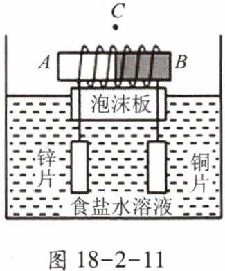 9. 如图 18 - 2 - 11 所示,为课外实践兴趣小组的同学自制的漂浮式指南针. 铜片、锌片和食盐水溶液共同组成了“盐水电池”. 铜片是盐水电池的正极,锌片是负极,下列说法正确的是(