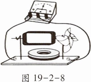 11. 如图19-2-8所示是小华用漆包线和磁体制作的一台发电机,制作时用刀片将线圈两端的漆全部刮掉,作为转动轴,用纸做一个小风车固定在转轴上,将转轴放在支架上,如图所示,将发电机与小量程电流表相连,转动小风车,电流表指针左右偏转,电路中电流的方向
