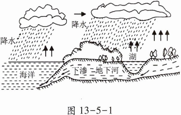 如图13-5-1是大自然中水循环现象的示意图。江、河、湖、海以及大地表层中的水不断蒸发变成水蒸气。当含有很多水蒸气的空气升入高空时,水蒸气的温度降低凝成小水滴或凝成小冰晶,这就是云。在一定条件下,云中的小水滴和小冰晶越来越大,就会下落。在下落过程中,小冰晶又变成小水滴,与原来的水滴一起落到地面,这就形成了雨。
