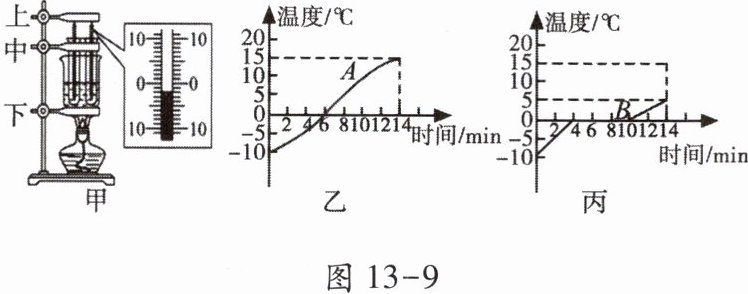 17. 在“探究固体熔化时温度变化规律”的实验中,将质量相等的A、B两种固体物质分别放入两个相同的试管中,再将两个试管同时放入装有水的大烧杯中加热,如图13-9甲所示. 图乙和图丙是根据实验数据绘制出的A、B两种物质温度随时间变化的图像.