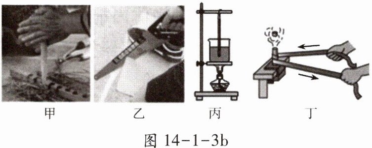 4. 如图14-1-3a所示是古人发明一种活塞式点火器,其用牛角做套筒,木质推杆前段粘有艾绒。取火时,一手握住套筒,另一手猛推推杆,艾绒即燃。随即将杆拔出,吹气立见火苗。图14-1-3b中与其改变内能的方式不同的是(