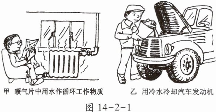 3. 在日常生活中,水既可以用来取暖(如图14-2-1甲),也可以用来降温(如图乙). 请利用比热容知识解释为什么用水而不用其他液体.