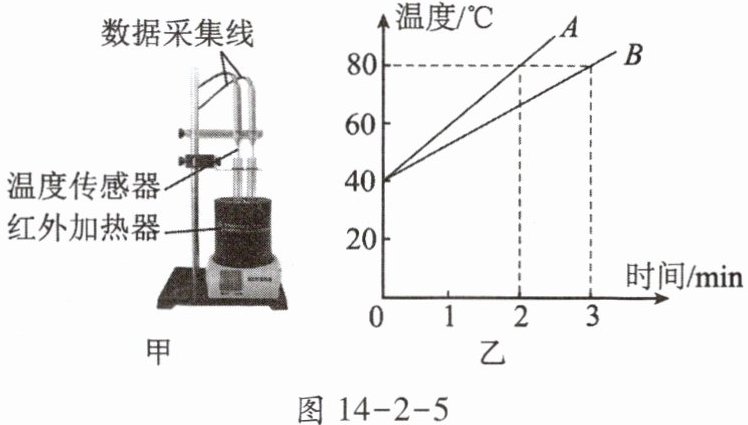 5. 某同学用图14-2-5所示的装置,比较不同物质的比热容. 将分别盛有质量均为 $100g$ 不同液体的两个相同试管固定在铁架台上,温度传感器的探头与液体良好接触,将温度传感器与计算机相连. 计算机上显示液体温度随时间变化的图线如图乙所示. 已知水的比热容是 $4.2× 10^{3}J/(kg\cdot^{\circ}C)$,不计热量损失,下列说法正确的是(