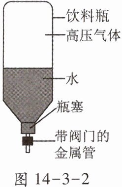 2. 如图 14 - 3 - 2 是小明用塑料瓶制作的水火箭:先在瓶里装适量水,然后将带有阀门的金属管插入瓶塞,旋紧瓶塞后用打气筒往瓶里打足气,此时气体内能