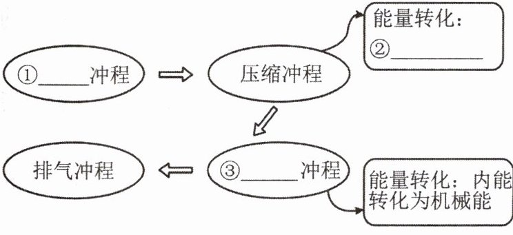 3. 学习“内燃机”这节课后,小明作出如图 14 - 3 - 3 所示的流程图来分析汽油机的四个冲程及其能量转化关系。请你帮小明将空白处的内容补充完整。