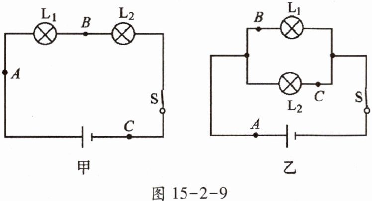 11. 在图 15 - 2 - 9 甲、乙所示电路的 $ A $、$ B $、$ C $ 各点,分别标出电流的方向。
