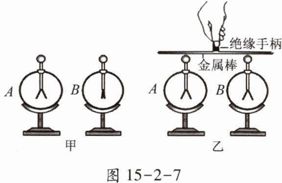 9. 如图 15 - 2 - 7 甲所示,取两个相同的不带电的验电器 $ A $ 和 $ B $,用与丝绸摩擦过的玻璃棒接触验电器 $ A $ 的金属球,使 $ A $ 带电。然后用带有绝缘手柄的金属杆把 $ A $ 和 $ B $ 连接起来,$ A $ 的金属箔片张开的角度减小,$ B $ 的金属箔张开,如图乙所示。则(