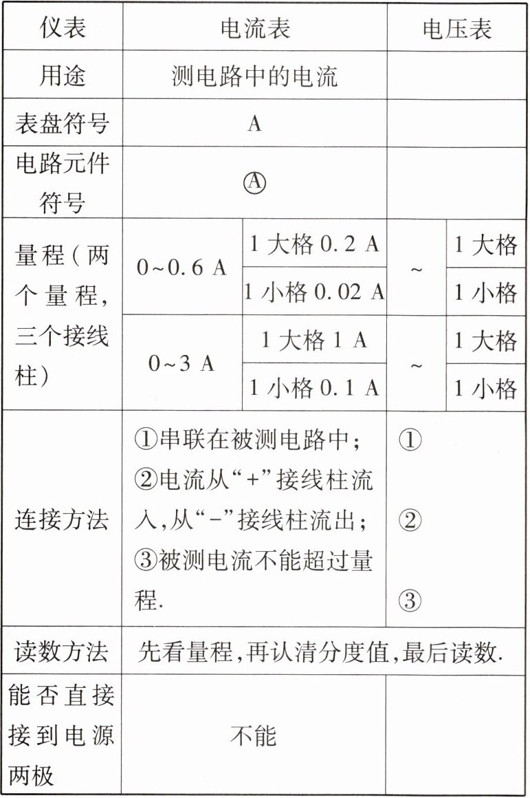 ||连接方法|①串联在被测电路中;②电流从“+”接线柱流入,从“-”接线柱流出;③被测电流不能超过量程。|①