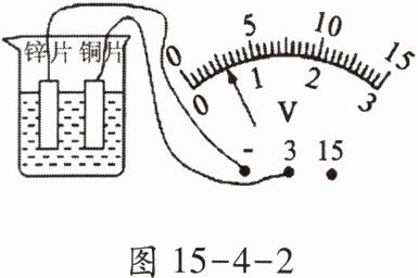 联。4. 如图15-4-2所示,在烧杯中加入盐水,然后将连在电压表上的铜片和锌片插入盐水中,这样就制成了一个盐水电池。观察电压表的接线和指针偏转可知,锌片是盐水电池的