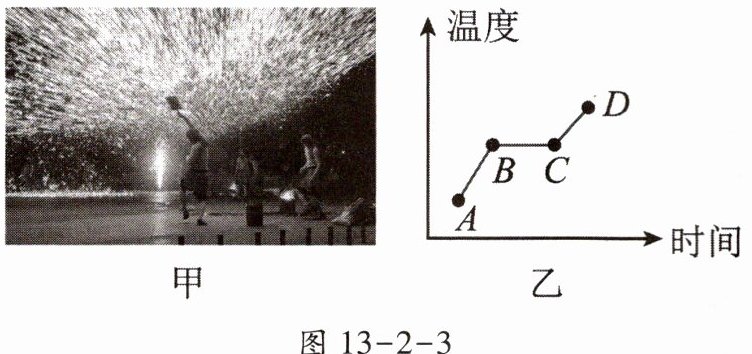 4. 如图13-2-3甲所示,将1600℃的铁水抛向高空,化为漫天华彩,遍地生金,这是来自中国传统民俗文化表演技艺——“打铁花”的浪漫。小明通过网上查阅了解到铁在熔化过程中温度随时间变化图像如图乙所示。关于“打铁花”的过程,下列说法